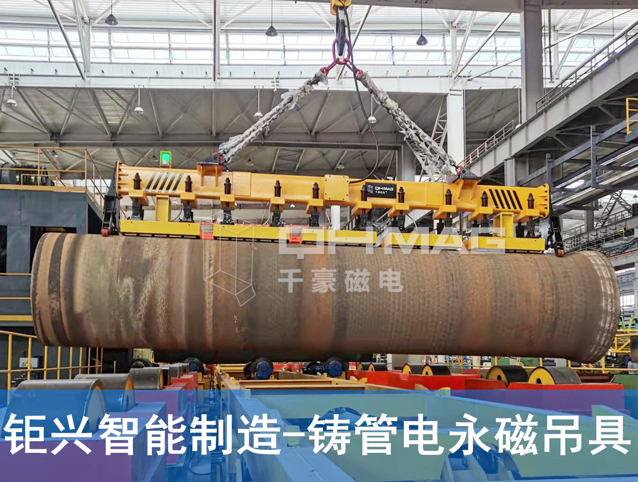 千豪電永磁吊具在吊鋼板,鋼管,鑄管等導磁工件上取得廣大顧客的認可與返購。使用電永磁吊具吊裝鋼管及鑄管圓形導磁工件,只需要吸附一部分接觸面即可吸吊起8噸、10噸、16噸,32噸.