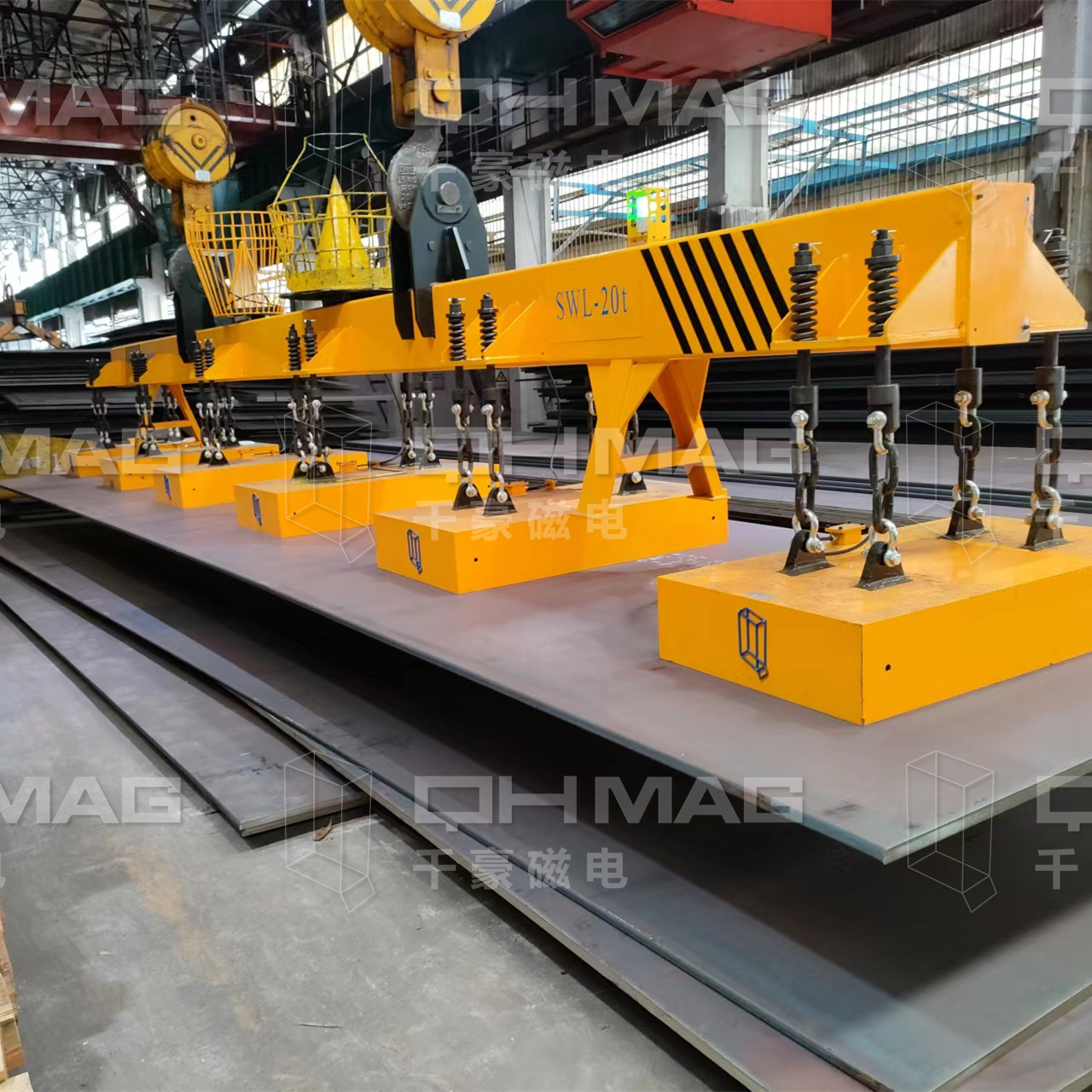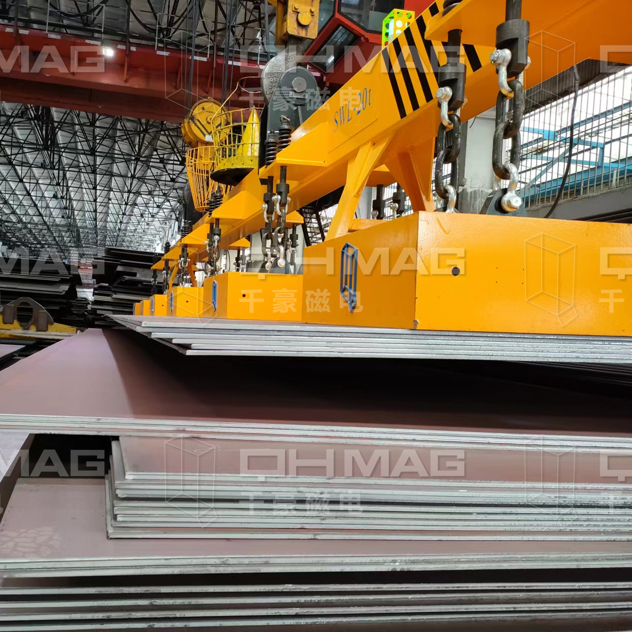 千豪磁電電永磁吊具可實(shí)現(xiàn)多張鋼板同時(shí)起吊,能適應(yīng)一定量的擾度變形,抗氣隙能力強(qiáng),多檔調(diào)磁,可實(shí)現(xiàn)多張起吊,單張放料。本次吊運(yùn)要求:鋼板溫度≤300℃,安全吸放多張鋼板能力要求根據(jù)鋼板厚度、鋼板寬度、鋼板長度來設(shè)計(jì)安全吸吊能力(張數(shù))。此款電永磁吊具可實(shí)現(xiàn)最多8張鋼板的吊運(yùn)。