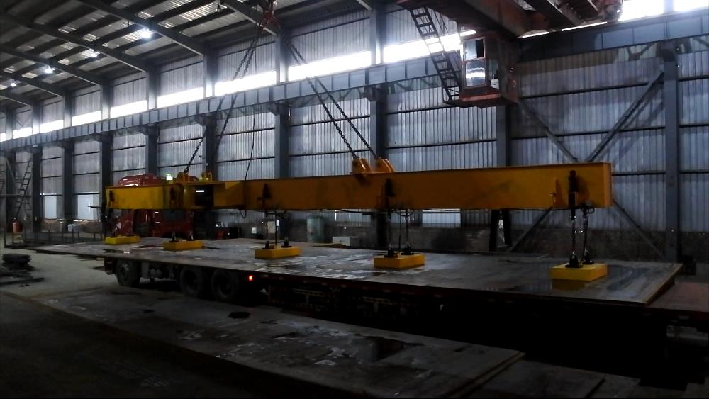 電永磁鐵聯(lián)用。對于中厚板(6mm~32mm)電磁鐵的間距多取3~4米,兩端外伸部分的長度可取間距的二分之一。根據(jù)吊運張數(shù)的不同,又分為350型與400型兩類。350型適合于中厚板廠、造船廠、機械制造廠,采用調磁控制方式,能起吊一張或一定張數(shù)鋼板。400型適用一次搬運盡量多的張數(shù),可根據(jù)用戶要求另行設計制造吊運700℃以下鋼板用高溫型產品。